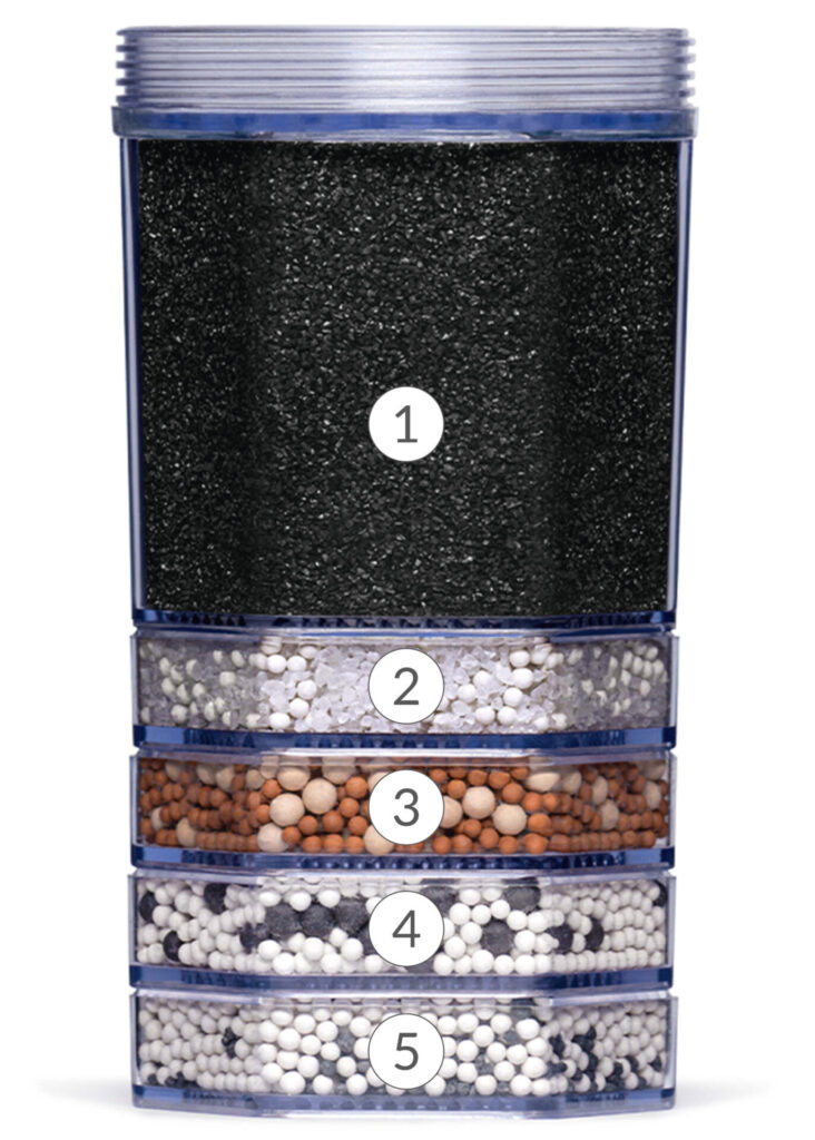 Die erste und größte Kammer filtert Medikamente, Pestizide, Schwermetalle und weitere Schadstoffe. Ein Kalium-Ionentauscher reduziert dabei effektiv Kalkgehalt und reichert das Wasser mit „gute Laune Mineral“ Kalium an.